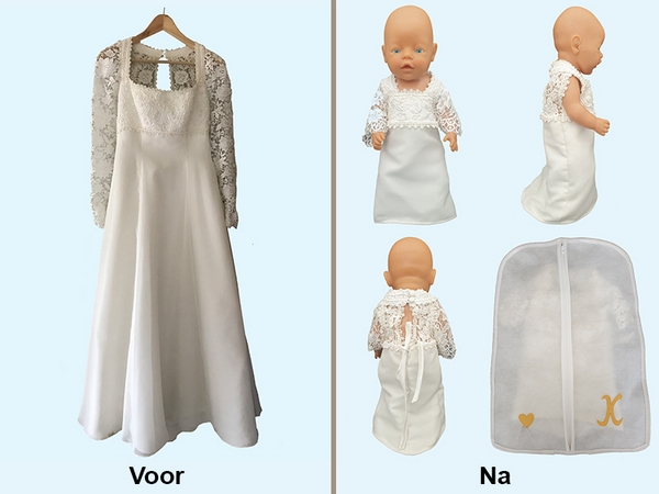 Een bijzondere vraag vond ik wel de vraag of ik van een trouwjurk een verkleinde versie kon maken van het origineel. Daar aan toe gevoegd dat de trouwjurk door 2 zussen gedragen was maar dan met wat kleine verschillen in details. Uiteindelijk werd dit het resultaat! En om de jurken goed te kunnen bewaren heb ik ook 2 kledingzakken gemaakt voor de jurken uit de kledingzak van de originele kledingzak die bij de trouwjurk zat. |