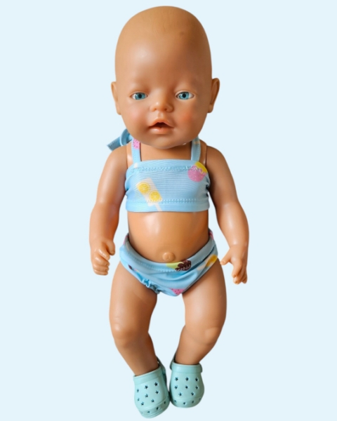 Bikiniset van mint stof met ijsjesmotief bestaande uit bovenstuk met striksluiting in de nek en klittenbandsluiting op de rug en broekje met elastieken band.