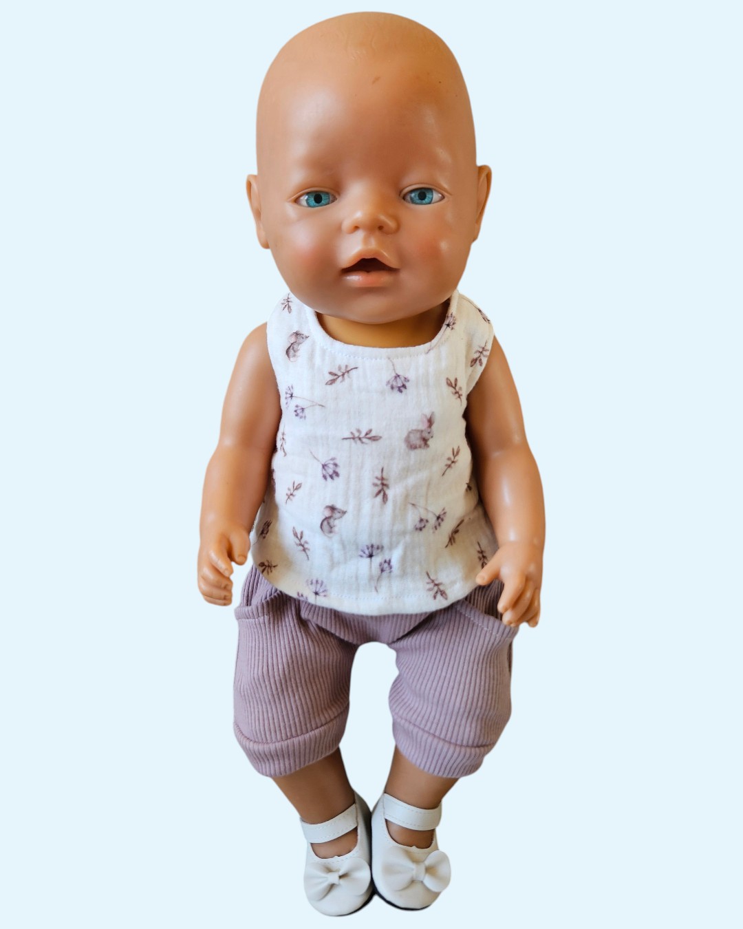 Gecombineerd met mouwloze top van witte hydrofiel stof met konijntjes motief in mauve tinten.