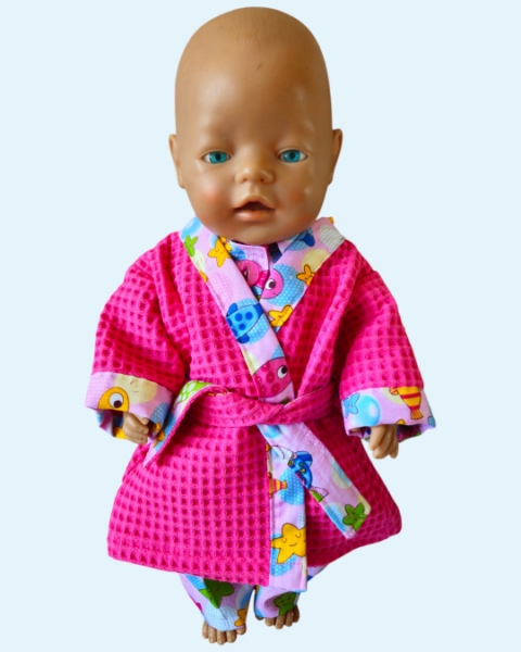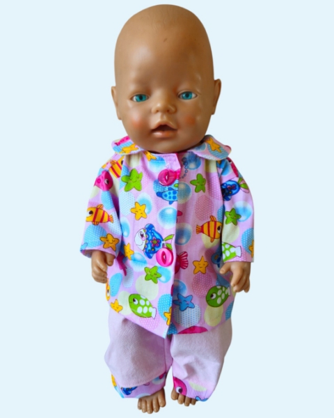 Pyjama van roze stof met visjesmotief. Pyjamajasje sluit voor met knopen. Broek met elastieken band. Pyjama past goed bij Badjas Vis Roze en Slaapzak Vis Roze.